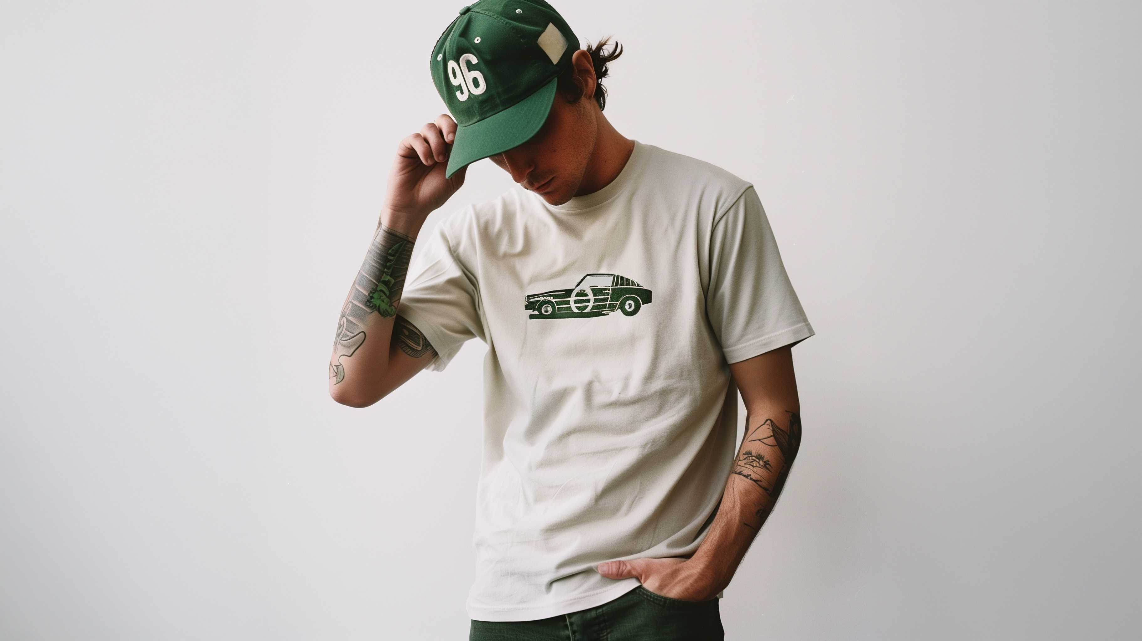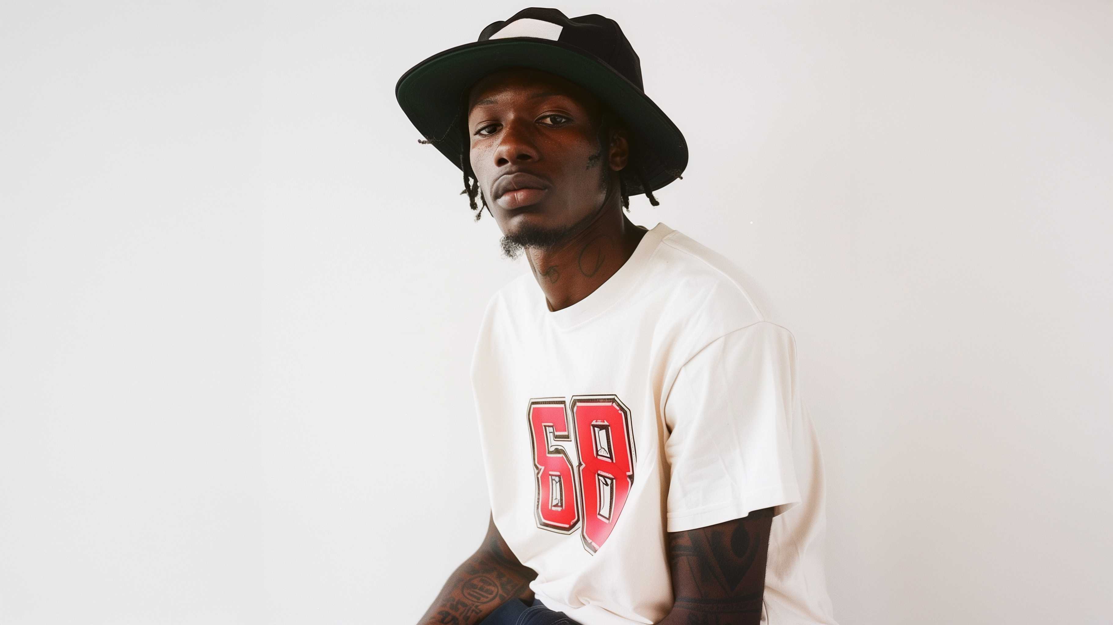 Modelo masculino estiloso, com expressão confiante, usando roupa urbana elegante (camiseta lisa preta ou branca, jaqueta minimalista, calça slim).